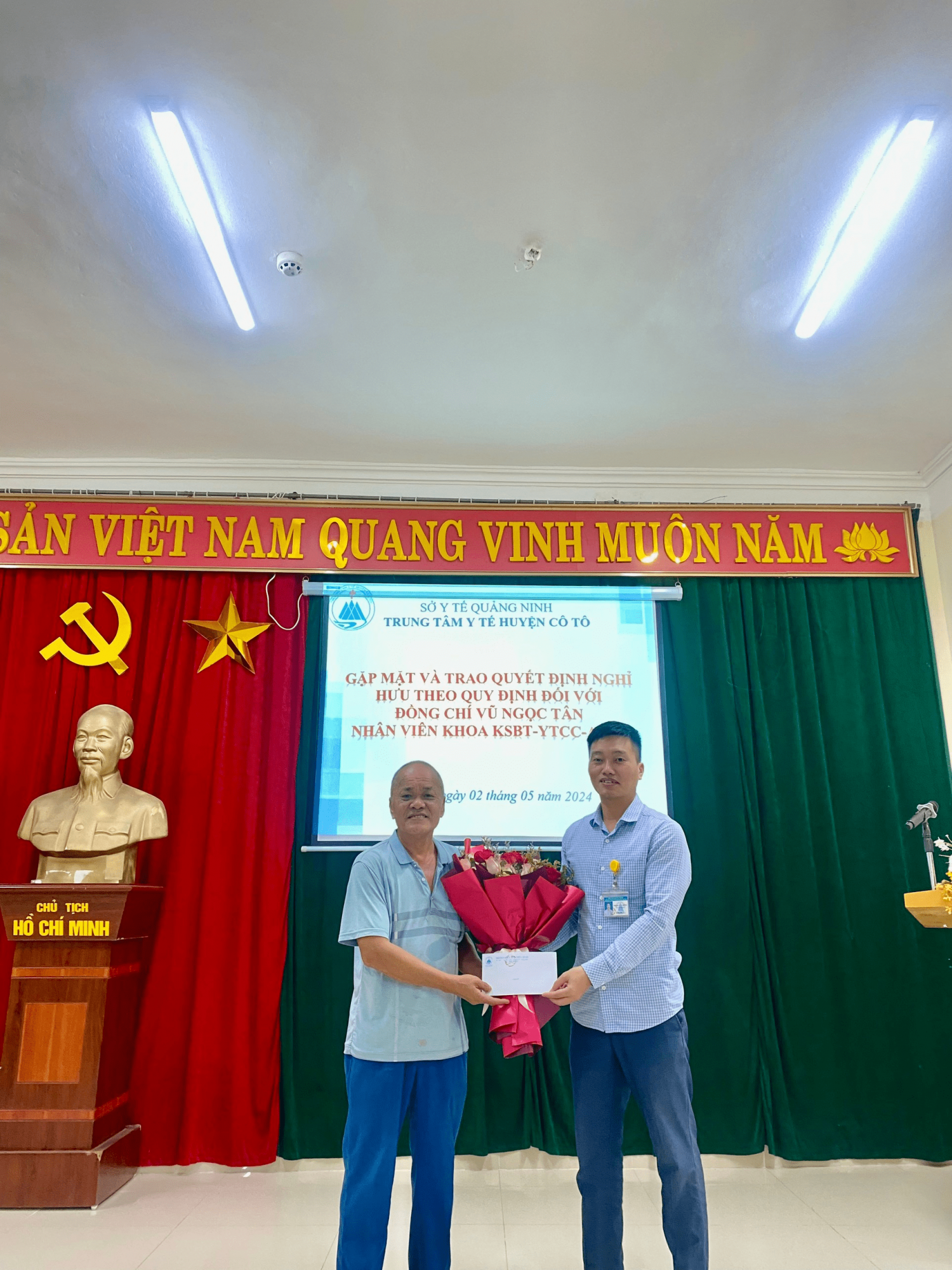 Theo quyết định số 45/QĐ-TTYT của Trung tâm Y tế huyện Cô Tô, từ ngày 1-5-2024, đồng chí Vũ Ngọc Tân được nghỉ hưu để hưởng chế độ bảo hiểm xã hội theo quy định.